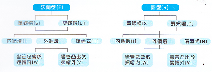 螺帽種類的選用乃依據(jù)使用條件,滾珠螺桿螺帽分類代號如下說明