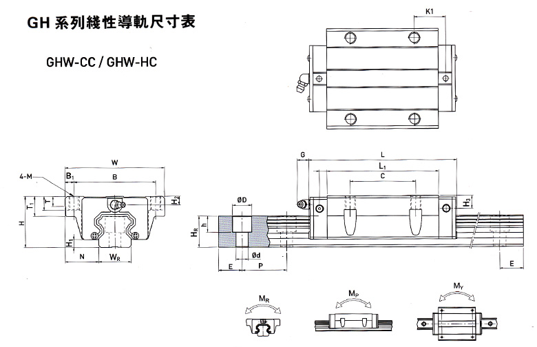 H H1 N W B B1 C L1 L K1 G M T T1 H2 H3 WR HR D h d P E mm C(kN) C0(kN) MR MP MY