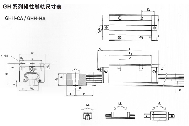H H1 N W B B1 C L1 L K1 G M×L T H2 H3 WR HR D h d P E mm C(kN) C0(kN) MR MP MY